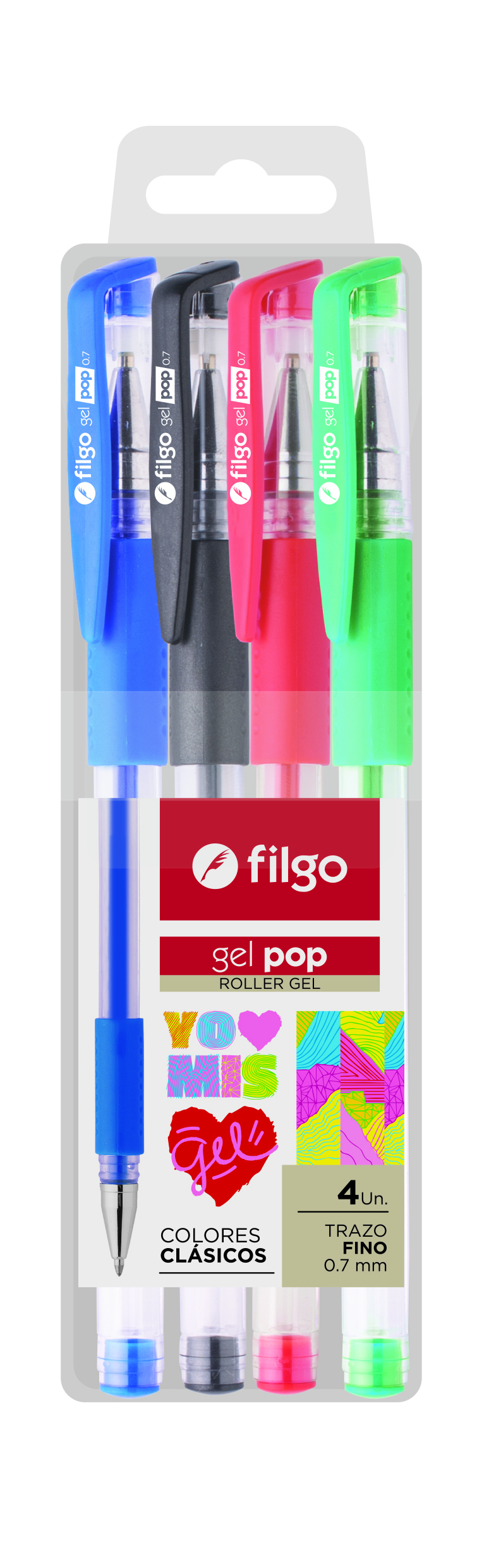 BOLIGRAFO FILGO ROLLER GEL POP ESTUCHE X4U. (GP7-E4-CLA) cantidad